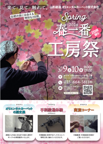 イベント【山形イベント情報3/9〜10】2024 春一番 工房祭が開催!(山辺町) 2024年3月9日〜10日、山辺町にあるオリエンタルカーペット本社工房にて「2024 春一番 工房祭」が開催されます! 2024 春一番 工房