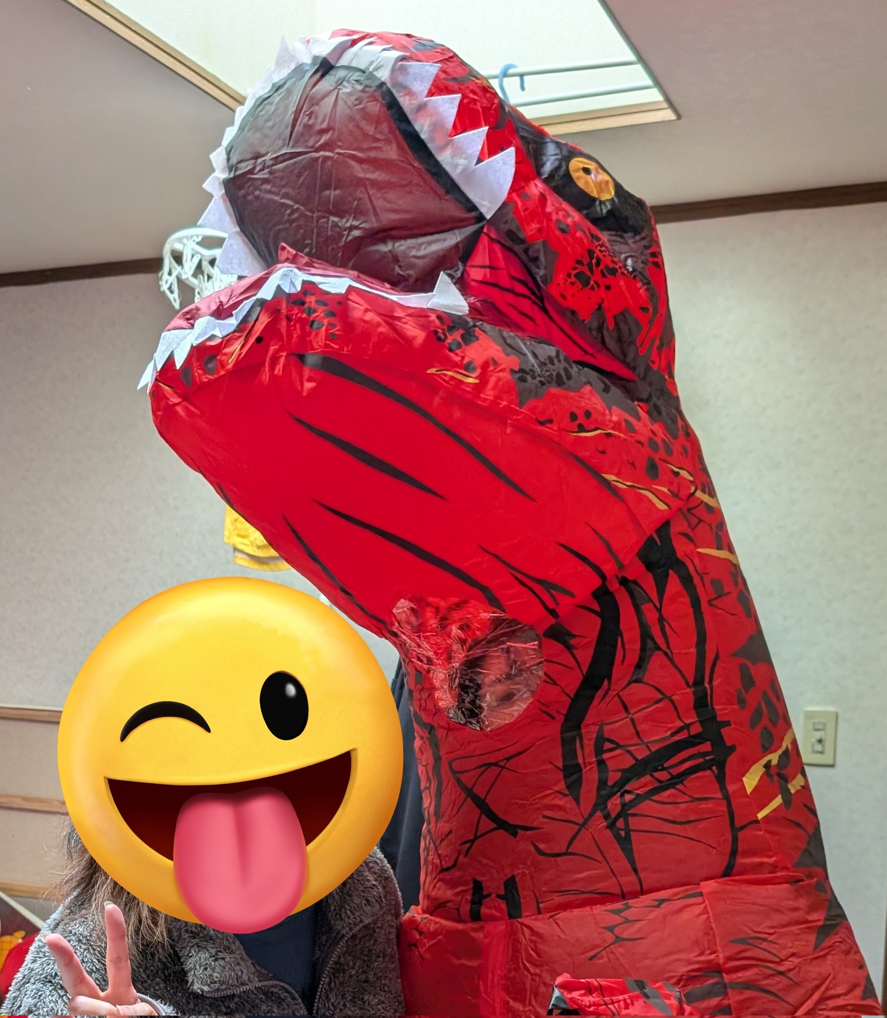 この着ぐるみって、実は単三電池4本でファン回した空気で膨らんでいるんです。