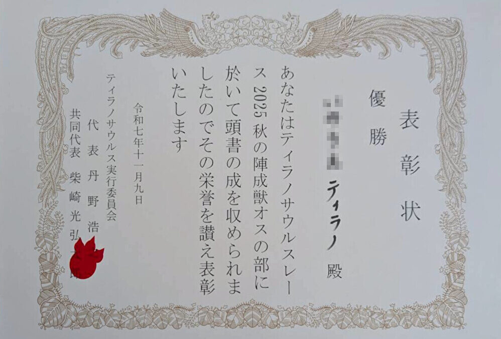 成獣♂の部で優勝された方にお願いして賞状写メらせて頂きました。