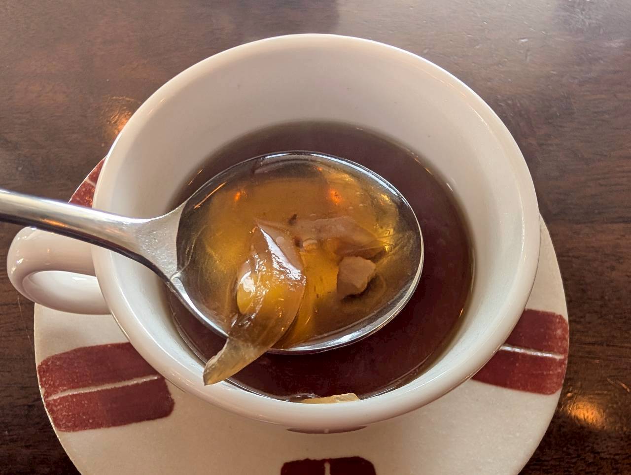 底の方に玉ねぎ、コーン、お肉等の具材が沈んでいます。