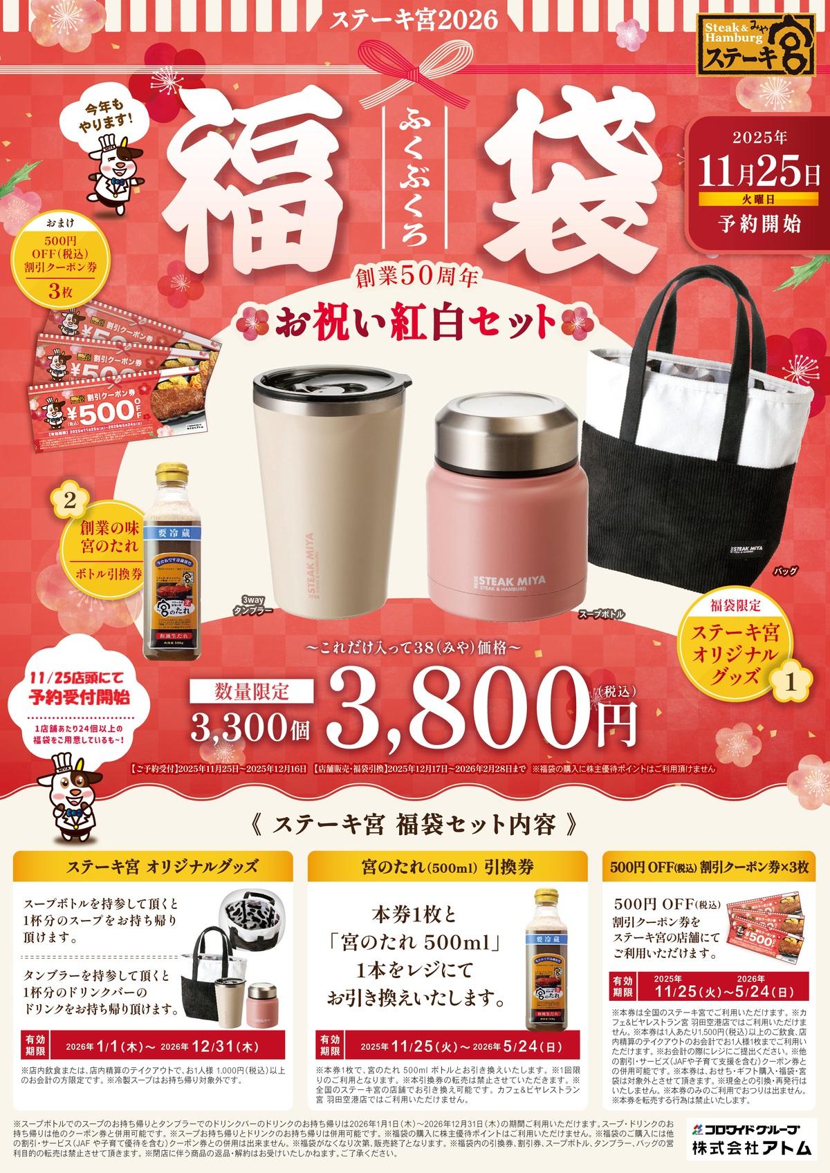 2026年のステーキ宮の福袋は、創業50周年を記念した「お祝い紅白セット」!