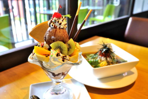 「明太子おろしスパゲティ(冷製パスタ)」と「チョコレートパフェ」をいただきました。