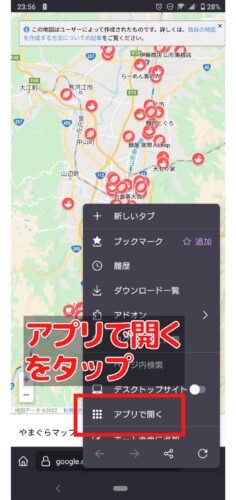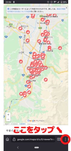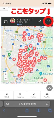 スマホヤパソコンのブラウザ(SafariやEdge、firefoxなど)ではなく、Google Map上で見たいと方は、マップ右上(画像の赤丸部分)をタップしてください。