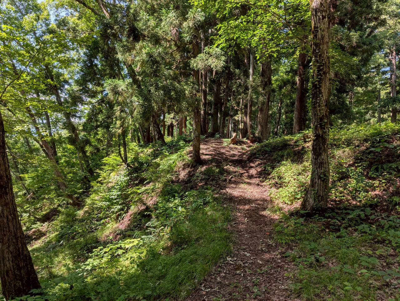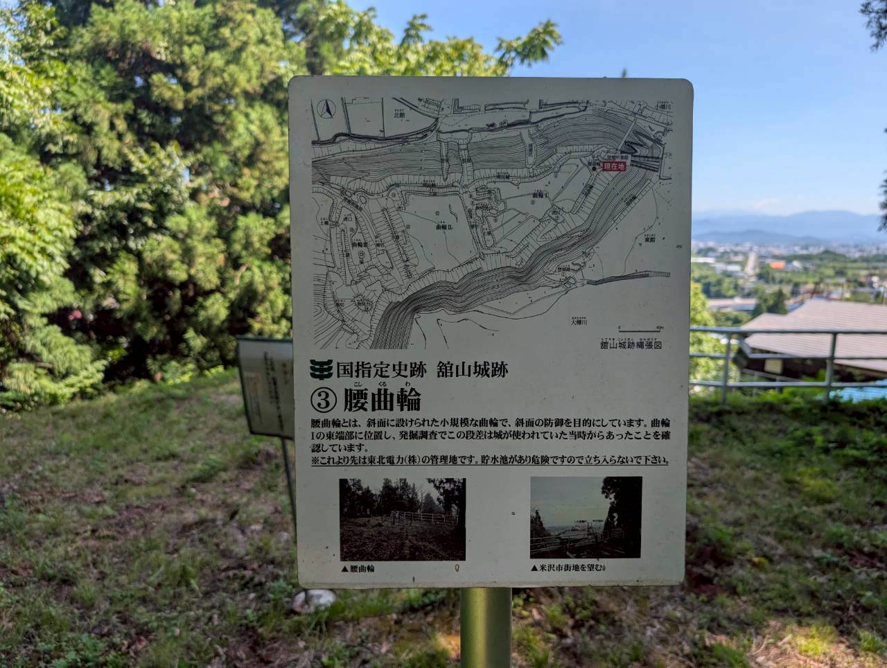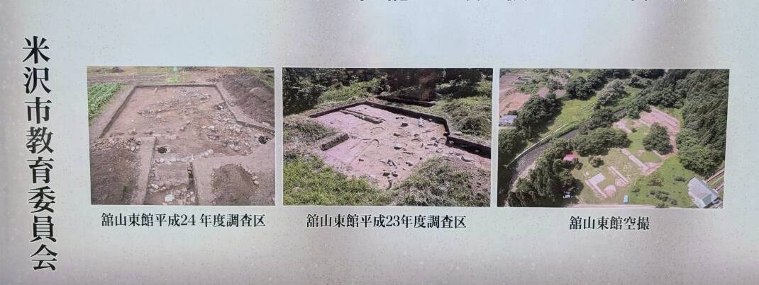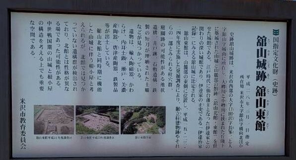 舘山城跡は、米沢市西部の大字舘山および口田沢に所在する山城を中心とした城館跡です。標高310~330メートルの舌状丘陵の先端部に築城され、南側の大樽川、北側の小樽川を堀とした天然の要害です。古くから伊達氏に関わる城館として知られており、発掘調査で江戸時代初期の石垣が発見されたことから、上杉氏も整備したことが新たにわかってきました。