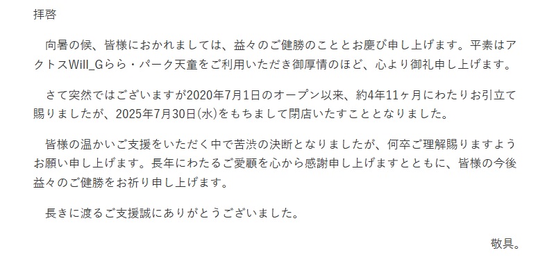 天童らら・パーク内、天童市南町の山形市寿町の「アクトスWill_G らら・パーク天童 」さんが7月30日に閉店しました。