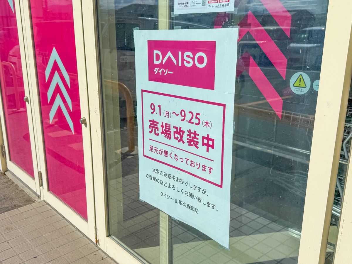 開店・閉店情報山形の話題2025年9月25日【山形リニューアル情報9/26】DAISOがリニューアル!保存する共有:どーも!山形プチ情報担当のガタロウです!2025年9月25日、山形市にある「DAISO山形久保田店」がリニューアルだ!DAISO山形久保田店がリニューアル!ってことで現地へ!改装はもう始まってて、9月25日まで。26日にリニューアルオープンです。店内はいつも通り営業しながら少しずつ改装を進めてる感じでした。住所です。〒990-2482 山形県山形市久保田1丁目1−13おすすめ記事