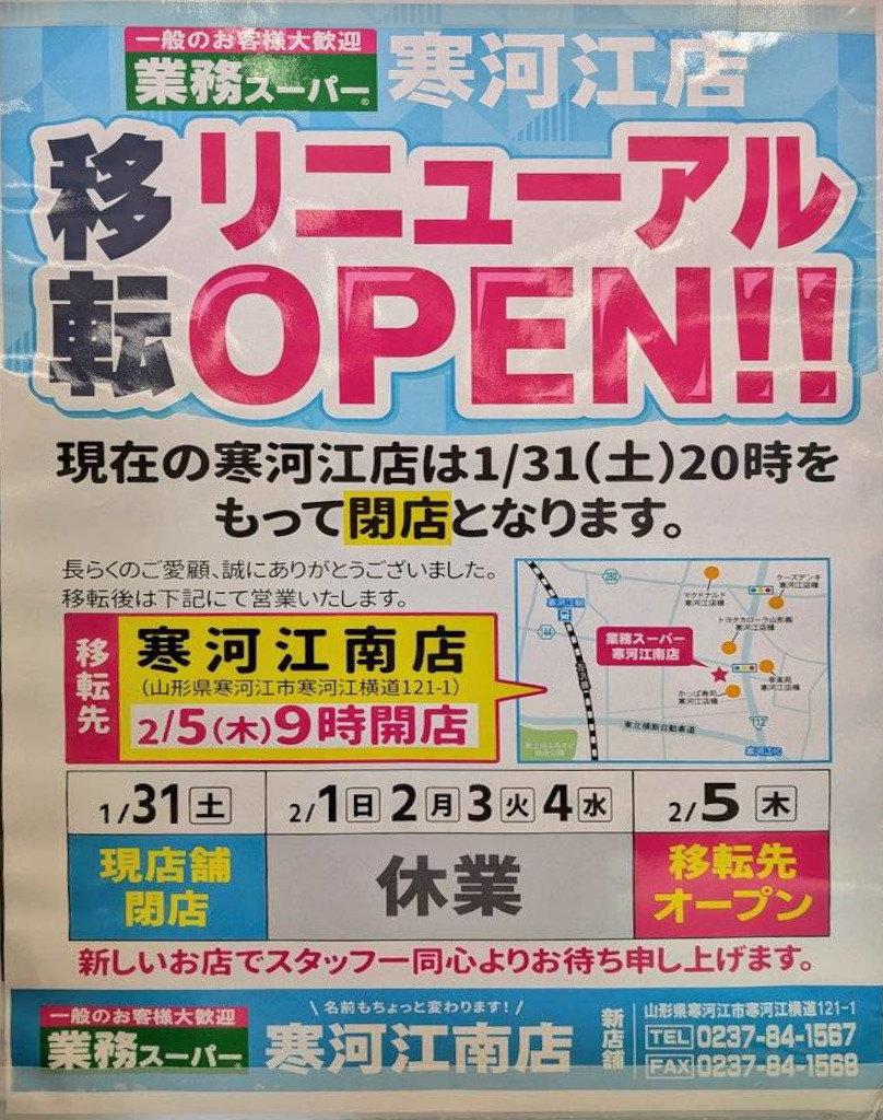 現在営業している業務スーパー寒河江店は1月31日(土)20時をもって閉店、