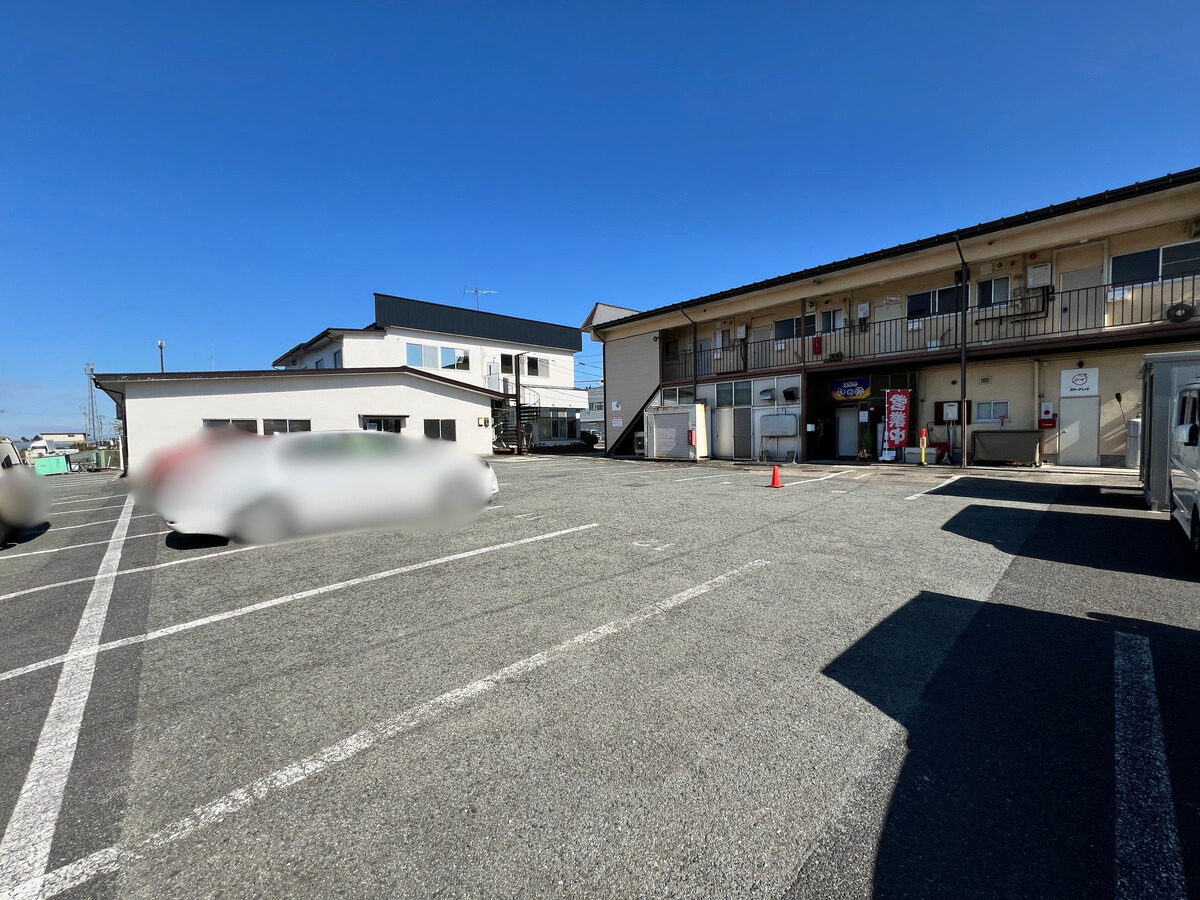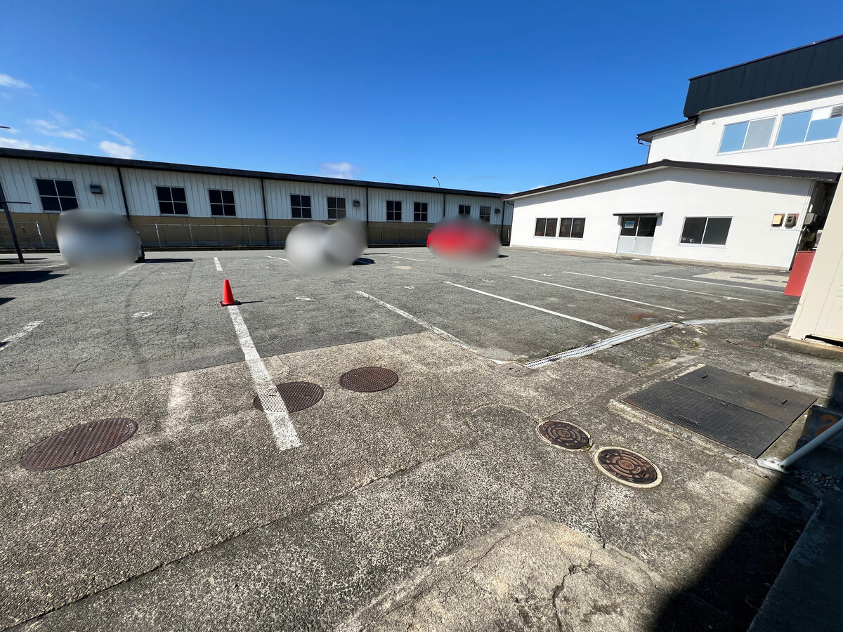 入口は裏側になります。広々とした駐車場も裏側にあります。
