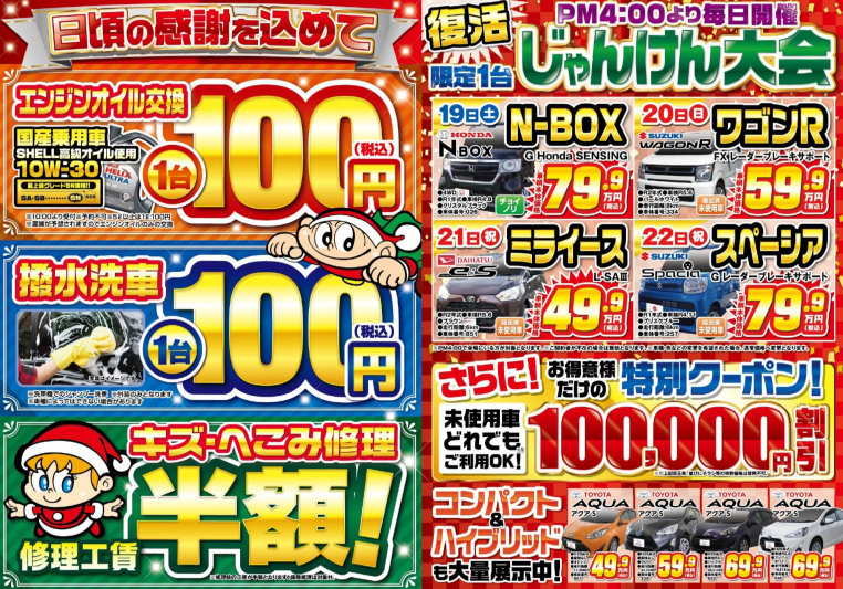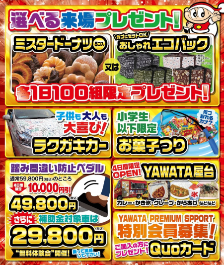 フランチャイズのため、運営元は異なるかもしれせんが、コバック酒田店の場合は先着プレゼントや「オイル交換・洗車が100円」のサービスがあったようです。