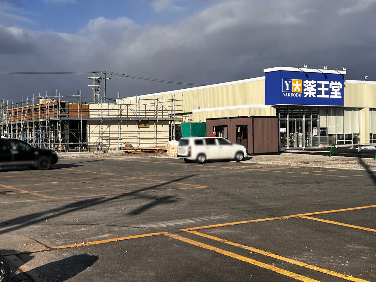 「オープンした中山町の薬王堂、そばを通った際、傍のスペース(ガソリンスタンド側の分譲の際に余った部分?)で何かの建築を開始する様子」