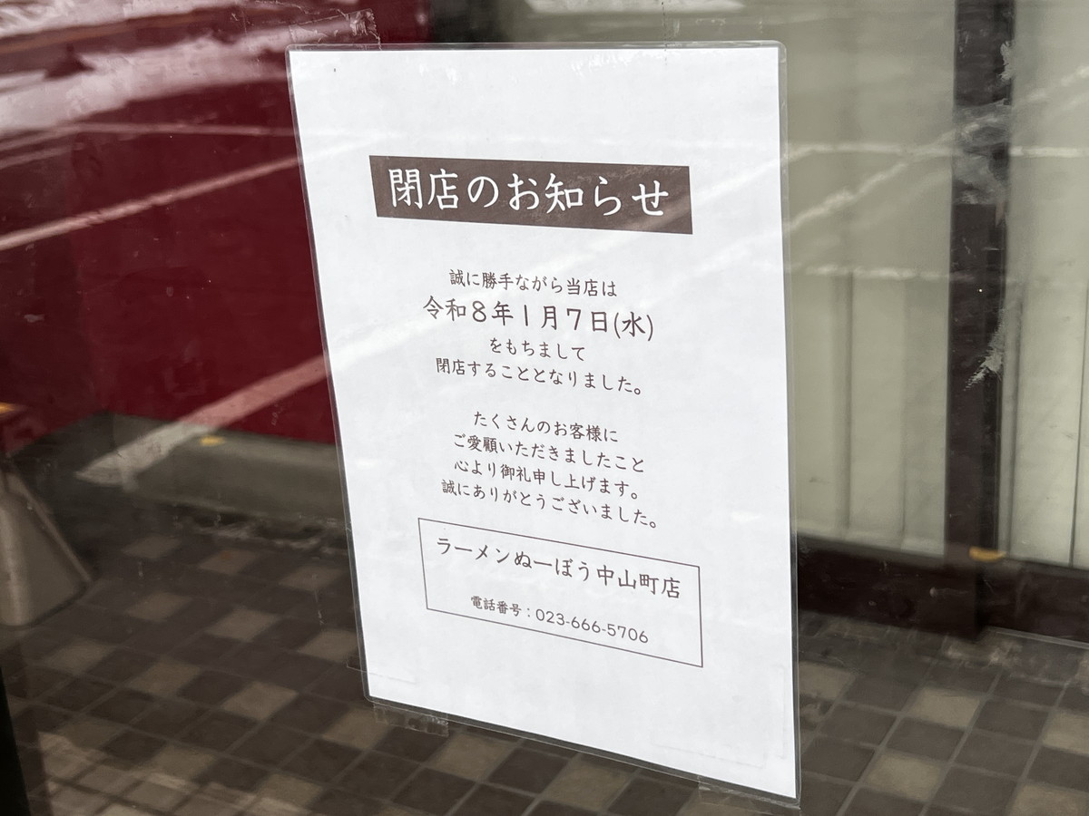 「ラーメンぬーぼう中山町店」さんが2026年1月7日(水)に閉店しました。