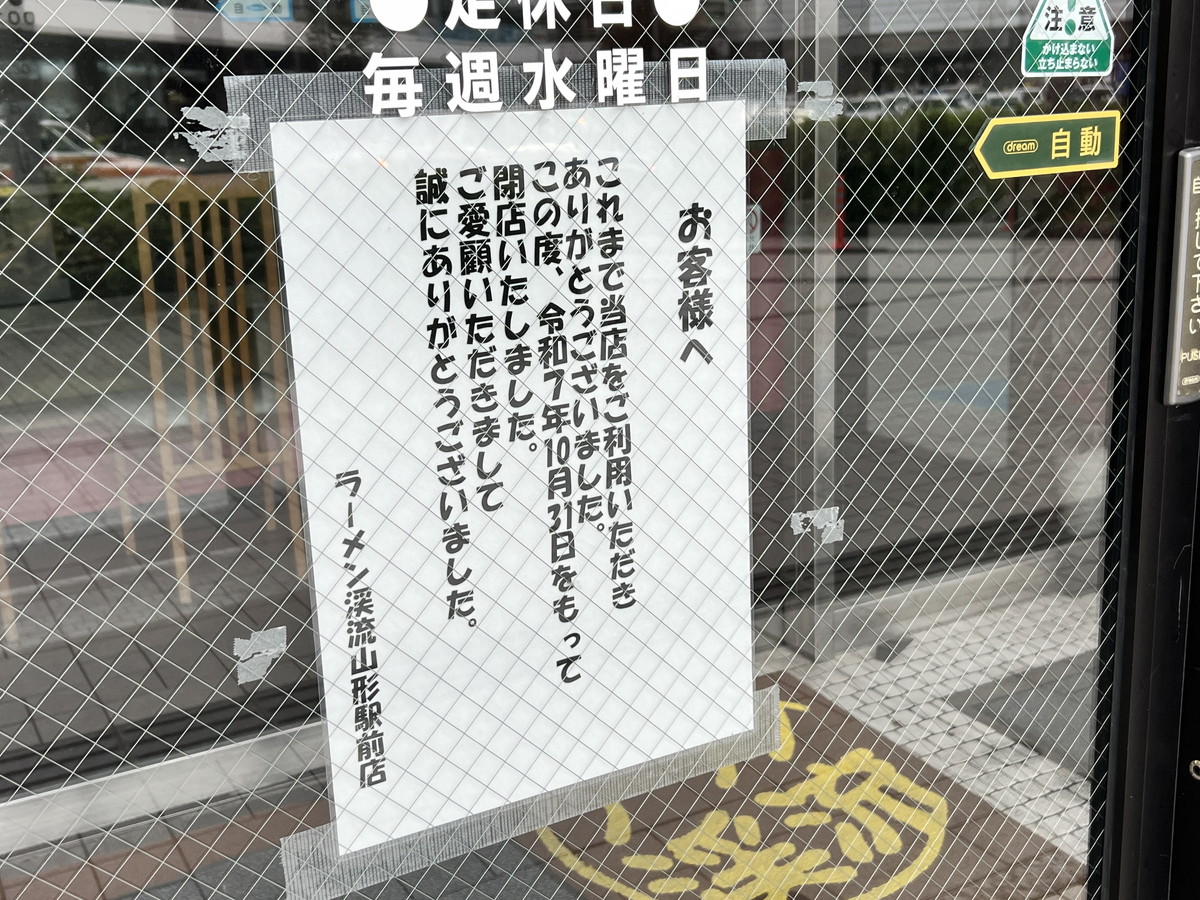 「ラーメン渓流 山形駅前店」が2025年10月31日に閉店しました。