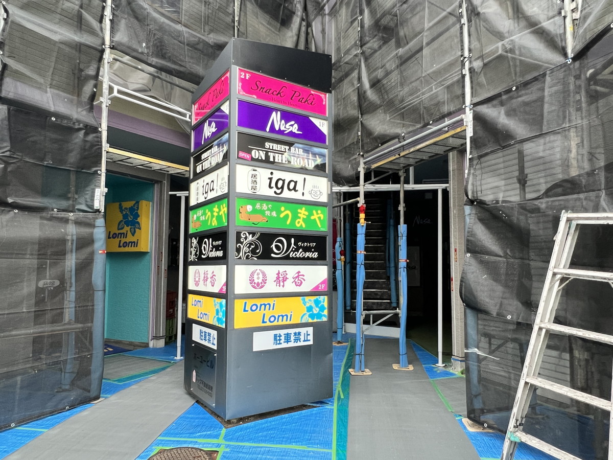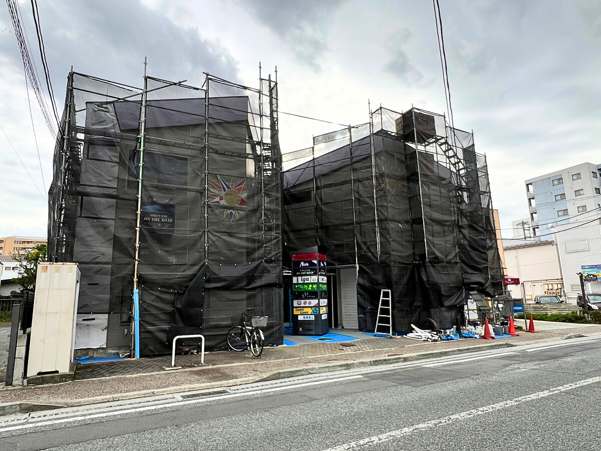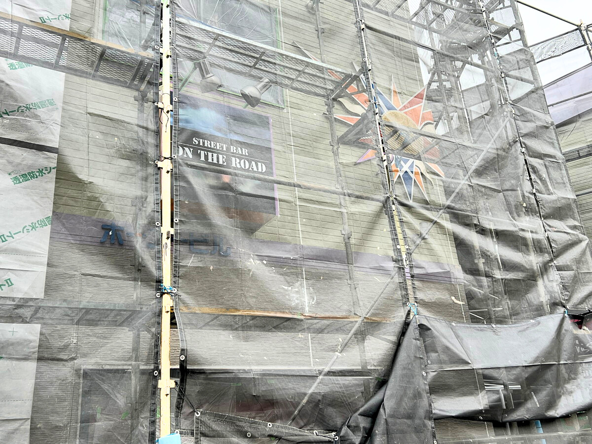 今現在外観工事をしているので壁にあるお店のかっこいい看板が見えないのが残念・・・なのですが、工事をしているのが目印になるかもしれません!