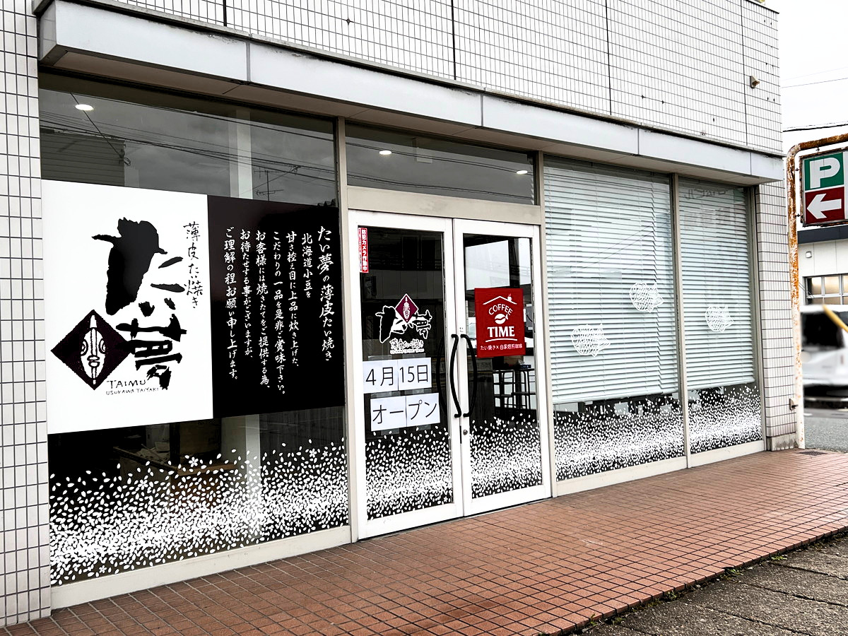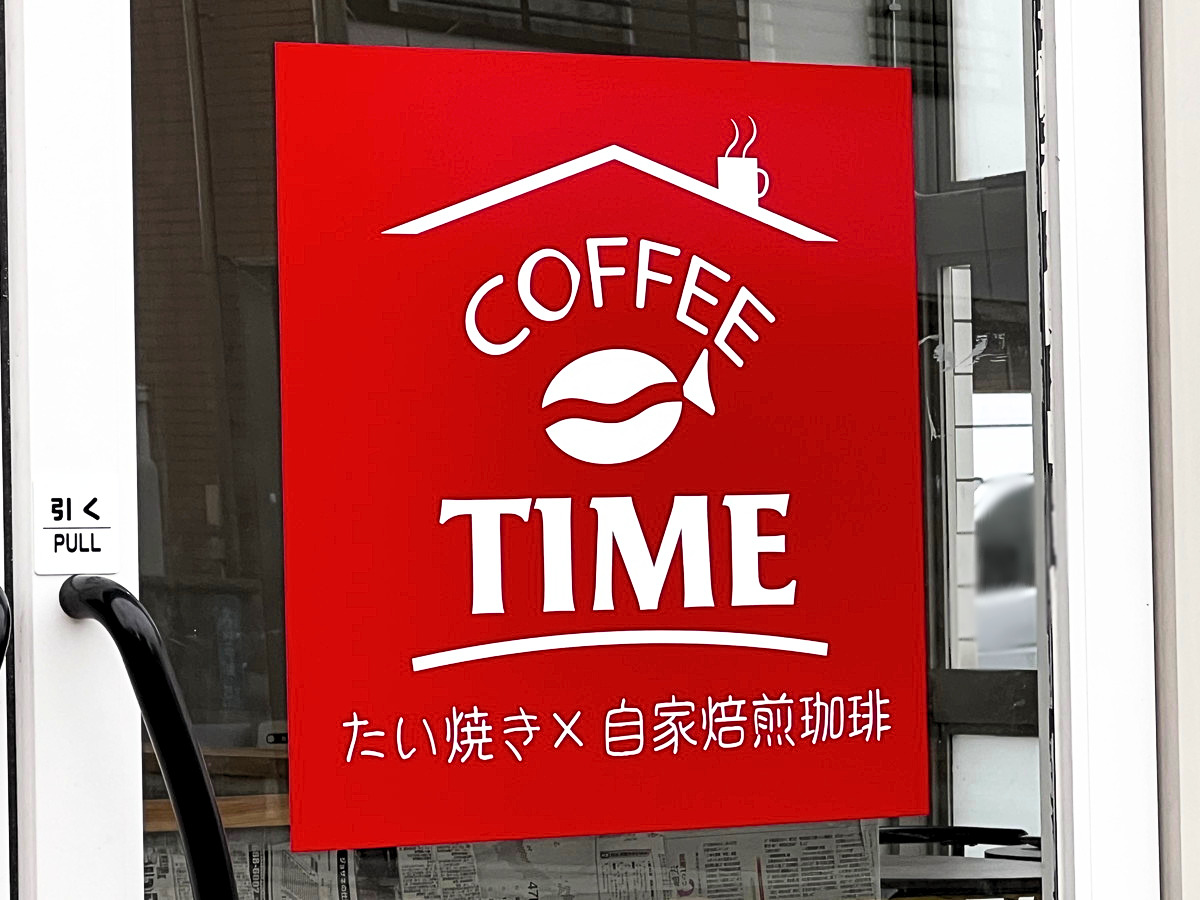 お店の外観には、「薄皮たい焼き たい夢」さんの店名の隣に「COFFEE TIME」と書かれたロゴがあり、ガラス張りの外観に映えるおしゃれなデザインが目を引きます。