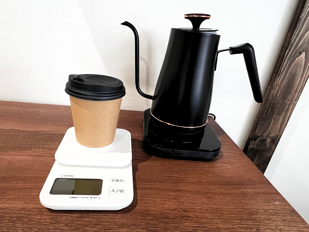 待つ時間や香りも楽しんでほしいという想いから、写真のようにおしゃれなポットや計りが用意されていて、自分でお湯を注ぐことができます♪