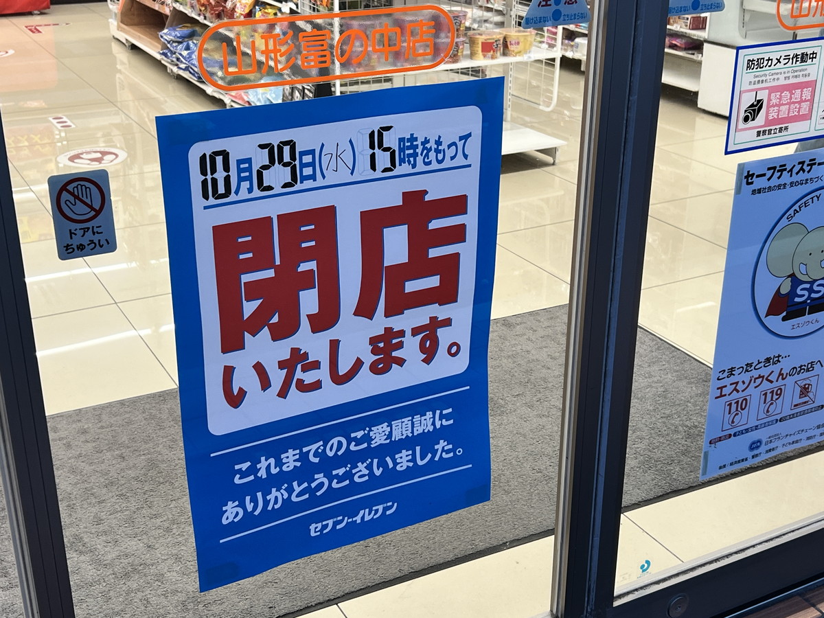 開店・閉店情報山形の話題2025年10月27日【山形閉店情報10/29】山形市内のコンビニが閉店保存する共有:こんにちは!ライターのぴんです!「富の中のセブンイレブンが10/29で閉店します」読者の「ぬるを」さん、「マコ」さん情報提供ありがとうございます!10月29日に「セブンイレブン山形富の中店」が閉店「セブンイレブン山形富の中店」さんが閉店します。お店に行ってみると閉店の貼り紙がありました。10月29日(水)15時に閉店とのことです。アクセス〒990-2463 山形県山形市富の中1丁目13−5おすすめ記事