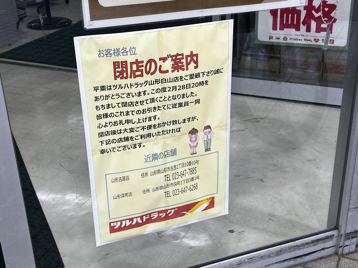「ツルハドラッグ山形白山店」さんが2月28日(土)20時に閉店します。