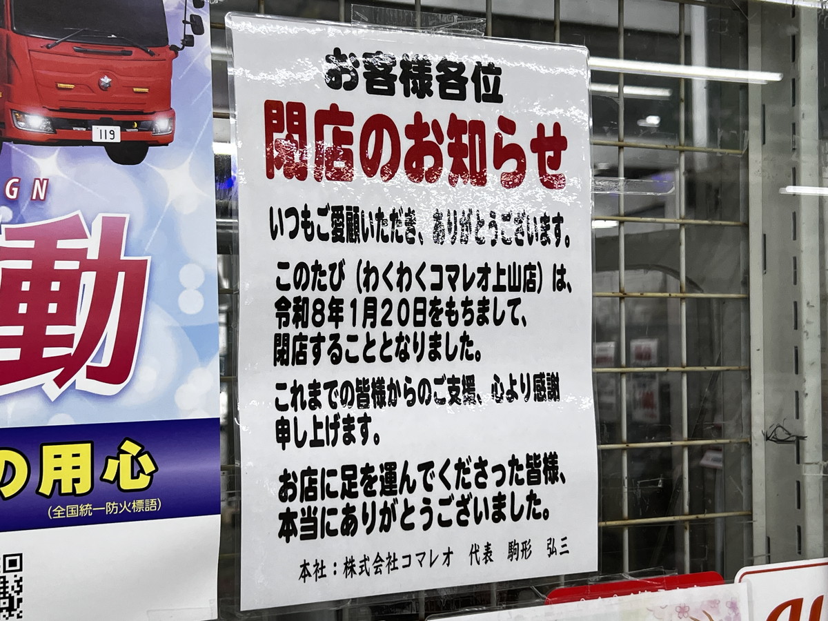 「わくわくコマレオ上山店」さんが2026年1月20日(火)に閉店します。