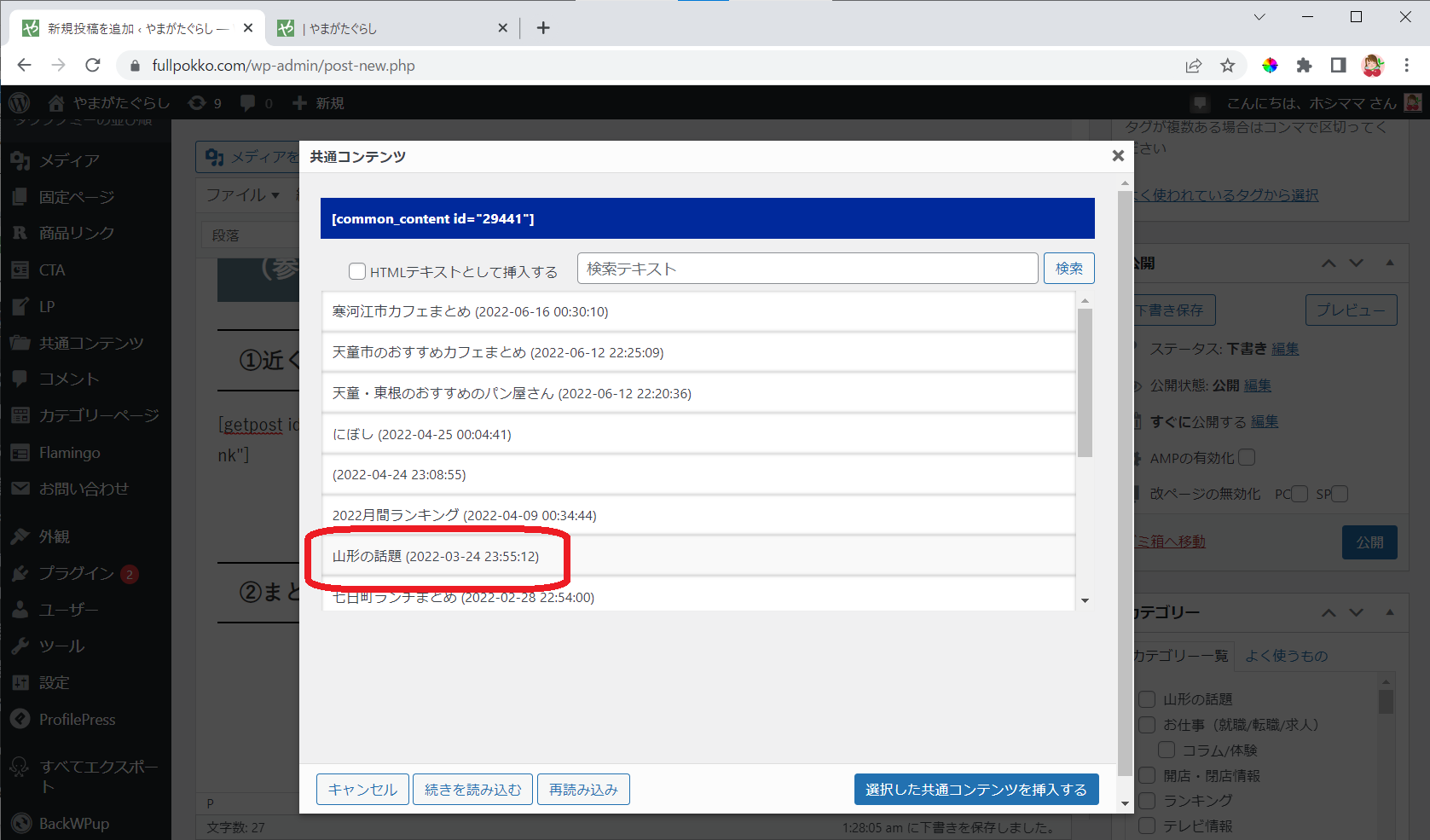 該当の項目をクリックし、「選択した共通コンテンツを挿入する」をクリックします。