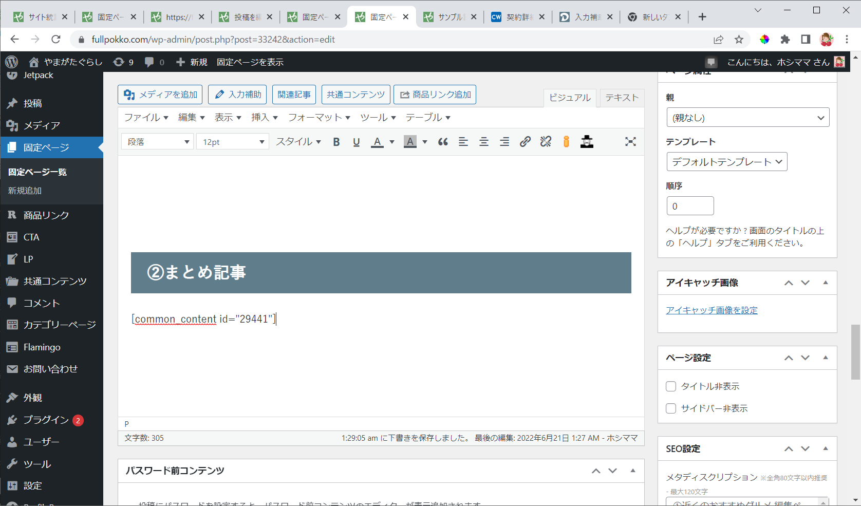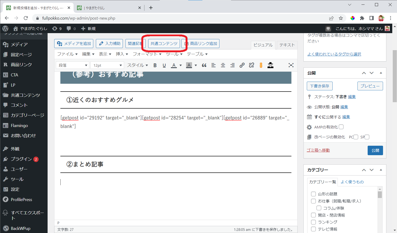 編集ページの「共通コンテンツ」ボタンをクリックします。