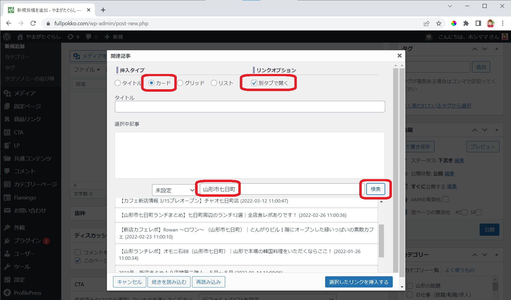 挿入タイプに「カード」、リンクオプションに「別タブを開く」をチェック、中央部部の検索BOXに「お店やイベントの住所(市町村と町名)」を入力し、「検索」ボタンをクリックします。