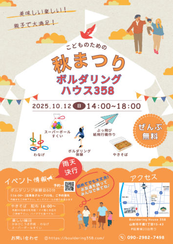 やまぐらパートナー【やまぐらピックアップ】いよいよ開催!美味しい楽しい秋祭り「やまぐらパートナー」からのおすすめ情報を紹介する「やまぐらピックアップ」! BOULDERING HOUSE 358さんからのお知らせです! ぜひ
