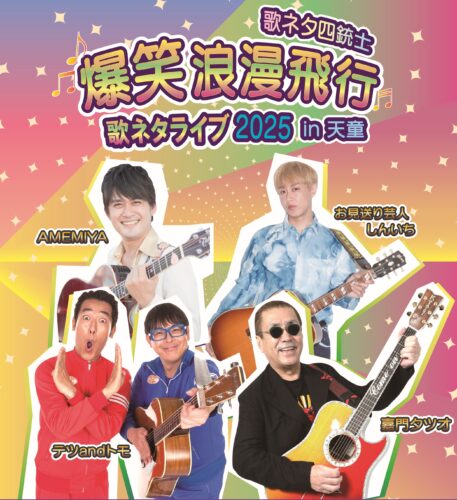 イベント【山形イベント情報11/8】歌ネタ四銃士 爆笑浪漫飛行 歌ネタライブ2025in天童笑って歌って、心まで元気になる! テレビで大人気の歌ネタ芸人たちが天童に集結し、ここでしか味わえない爆笑と感動を体験しま