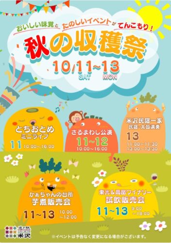 イベント【山形イベント情報10/11-13】秋の収穫祭(米沢市)秋の味覚が勢ぞろい! 道の駅米沢で、季節を満喫できる「秋の収穫祭」が開催されます。 秋の収穫祭 10月11日(土)~13日(月)の3日間、