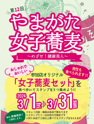 山形の話題【山形イベント情報3/1〜3/31】やまがた女子蕎麦が開催! 2024年3月1日〜31日まで「やまがた女子蕎麦」が開催されます! やまがた女子蕎麦 今年で第12回を迎えた『やまがた女子蕎麦』。
