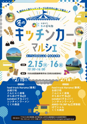 イベント【山形イベント情報2/15〜16】冬のキッチンカーマルシェ〜旧暦初市〜 2024年2月15日〜16日、市民会館整備事業用地(旧県民会館跡地)にて「冬のキッチンカーマルシェ」が開催されます。 冬のキッ