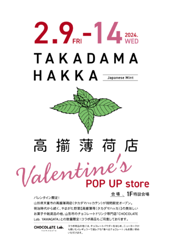 イベント【期間限定ショップ 2/9〜2/14】バレンタイン限定!天童市の高擶薄荷店がエスパルにやってくる!!! どーも、山形のプチ情報担当ヤマガタロウです! バレンタインシーズン限定のお知らせ! 天童市の高擶薄荷店(タカダマハッカ