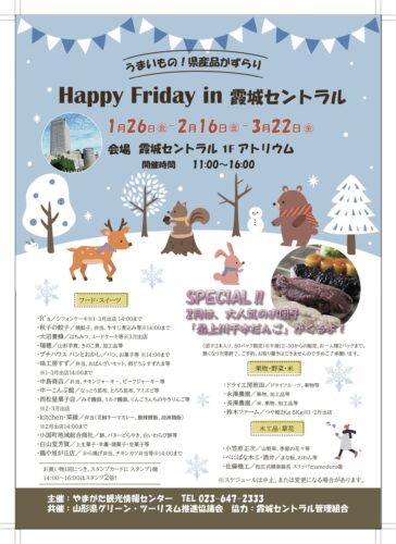 イベント【山形イベント情報 1/26】Happy Friday in 霞城セントラル どーも、山形のプチ情報担当ヤマガタロウです! 霞城セントラルで開催される「Happy Friday」、地元の魅力あふれる商品が満載です