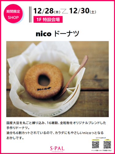 イベント【期間限定ショップ 12/28〜12/30】人気ドーナツショップがエスパルに再来!!! どーも、山形のプチ情報担当ヤマガタロウです! 以前ポップアップストアが大人気だった「nicoドーナツ」さんが再び出店するよう