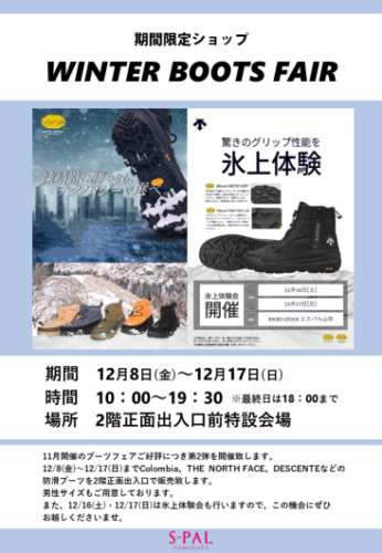 山形の話題【ブーツフェア 12/17まで】山形の必需品 ウィンターブーツのフェアが開催中! どーも、山形のプチ情報担当ヤマガタロウです! エスパル山形で11月に開催して好評だった「WINTER BOOTS FAIR」が、今週末(12/17(日