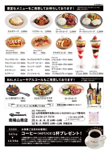 山形の話題【やまぐらピックアップ】南陽市のカフェの新メニュー情報をお届けします! 「やまぐらパートナー」からのおすすめ情報を紹介する「やまぐらピックアップ」! cafeHanamori南陽山南店 さんからのお知らせで