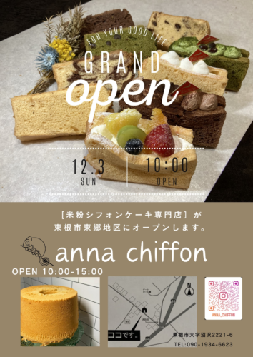 山形の話題【山形新店情報12/3】米粉シフォンケーキ専門店がオープン! 新店掲載フォームよりご依頼いただきました。 ありがとうございます! 2023年12月3日、東根市に米粉シフォンケーキ専門店「anna c