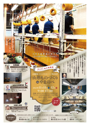 イベント【山形イベント情報11/11〜11/12】山形ものづくり in やまのべが開催 2023年11月11日〜12日に、山辺市にあるオリエンタルカーペット本社工房で「山形ものづくり in やまのべ」が開催されます。 山形