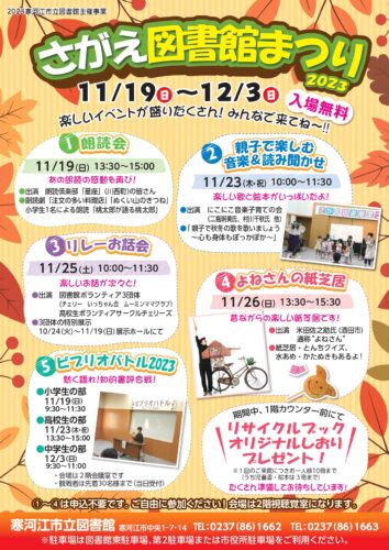 イベント【山形イベント情報11/19~12/3】さがえ図書館まつりが開催されます!(寒河江市) 2023年11月19日~12月3日まで、寒河江市立図書館にて「さがえ図書館まつり」が開催されます! 「さがえ図書館まつり」のポイント