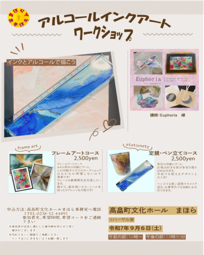 イベント【山形イベント情報9/6】まほらであそぼう『アルコールインクアートワークショップ』2025年9月6日(土)に、高畠町で「まほらであそぼう『アルコールインクアートワークショップ』」が開催されます。 まほらであそぼ