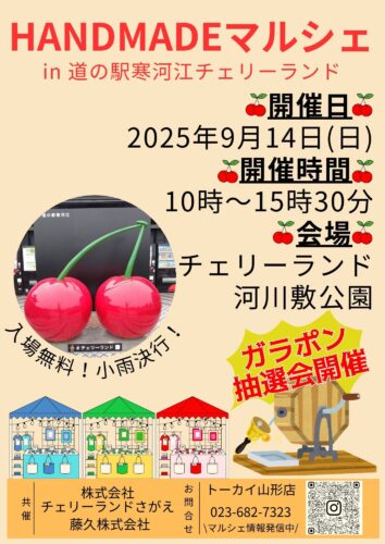 イベント【山形イベント情報9/14】第8回HANDMADEマルシェin道の駅寒河江チェリーランド(寒河江市)2025年9月14日(日)に、「第8回HANDMADEマルシェin道の駅寒河江チェリーランド」が開催されます。 第8回HANDMADEマルシェin道の駅寒河