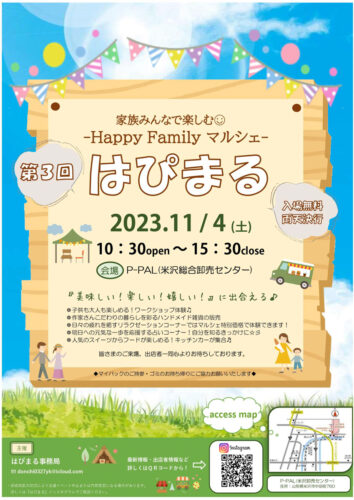 イベント【山形イベント情報11/4】- Happy Family マルシェ - はぴまるが開催!(米沢市) 2023年11月4日、米沢市で「- Happy Family マルシェ - はぴまる」が開催! - Happy Family マルシェ - はぴまる 「美味しい!」「楽しい!