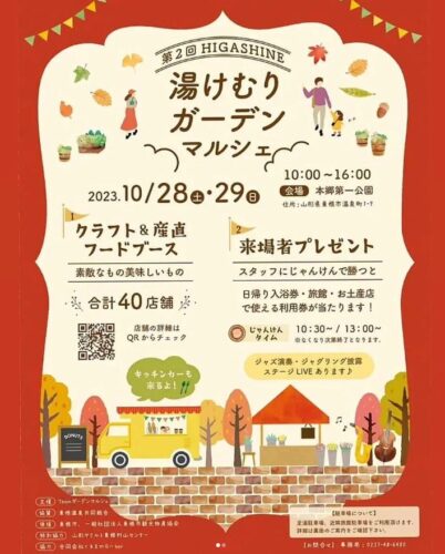 イベント【山形新イベント情報10/28・29】「湯けむりガーデンマルシェ」開催!(東根市) 10/28(土)・29(日)の2日間、東根市の本郷第一公園にて「湯けむりガーデンマルシェ」が開催されます。 この投稿をInstagramで見る 湯け
