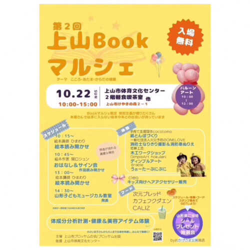 イベント【山形イベント情報10/22】第2回上山BOOKマルシェ開催(上山市) 2023年10月22日、上山市総合文化施設三友エンジニア体育文化センターで「第2回上山BOOKマルシェ」が開催されます。 第2回上山BOO