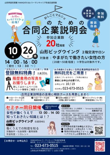 イベント【山形イベント情報10/26】「おしごとマルシェ」開催!(山形市) 10/26(木)、山形市の山形ビッグウイングにて「おしごとマルシェ」が開催されます。 YAMAGATA bizウーマンキャリア形成応援事業公式サ