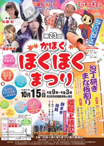 イベント【山形イベント情報10/15】「かほくほくほくまつり」開催!(河北町) 10/15(日)、河北町の町民体育館駐車場にて「かほくほくほくまつり」が開催されます。 河北町商工会公式サイトより引用 「かほく