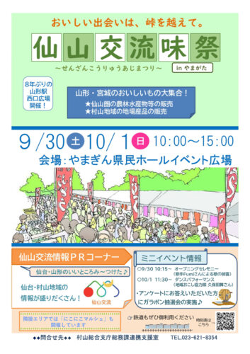 イベント【山形イベント情報9/30〜10/1】「仙山交流味祭inやまがた」が開催! 2023年9月30日〜10月1日、やまぎん県民ホールイベント広場にて「仙山交流味祭inやまがた」が開催されます! 仙山交流味祭inやま
