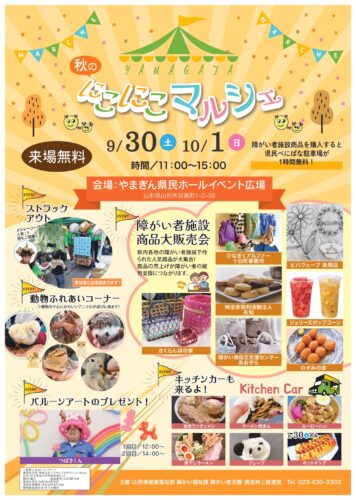 イベント【山形イベント情報9/30・10/1】「YAMAGATA秋のにこにこマルシェ」開催!(山形市) 9/30(土)・10/1(日)の2日間、山形市のやまぎん県民ホールイベント広場にて「YAMAGATA秋のにこにこマルシェ」が開催されます。 山形県