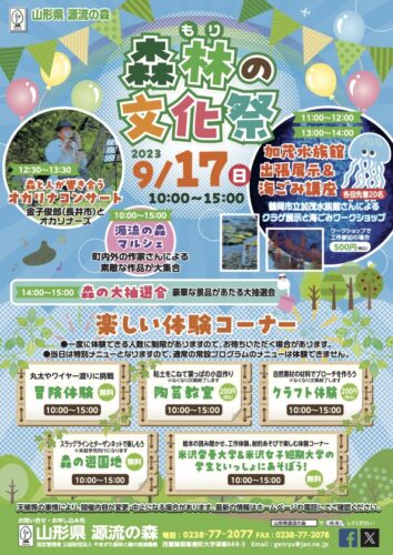 イベント【山形イベント情報9/17】森林の文化祭が開催されます!(飯豊町) 2023年9月17日、飯豊町の山形県源流の森で「森林(もり)の文化祭」が開催されます。 公式チラシはこちら 山形県 源流の森とは 源