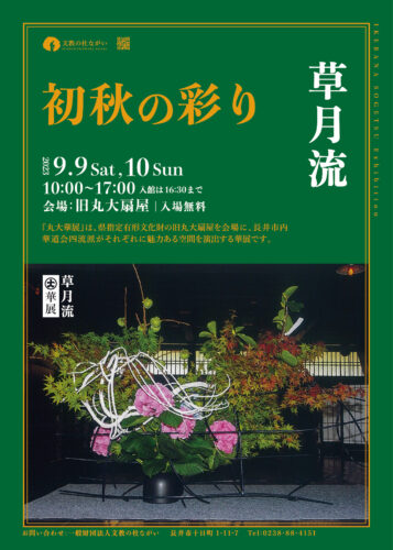 イベント【山形イベント情報】9/9〜10 丸大華展 「草月流 初秋の彩り」が開催されます。(長井市) 2023年(令和5年) 9月9日(土曜日)・10日(日曜日)の2日間、長井市の文教の杜ながい で、 「丸大華展 草月流 初秋の彩」が開催されます
