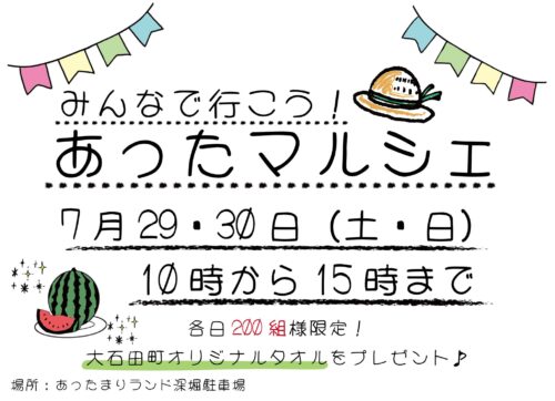 イベント【山形イベント情報7/29・30】「あったマルシェ」開催(大石田町) 7/29(土)・30(日)、大石田町にて「あったマルシェ」が開催されます。 マルシェ運営者公式Facebookより引用 「あったマルシェ」とは 「